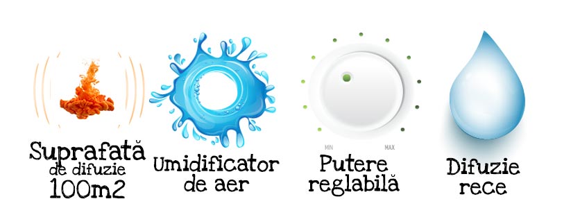 - Sistem de difuzie cu ultra sunete. Acest sistem crează o ceață mistică din amestecul de apă și ulei esențial. În acest mod sunt păstrate toate calitățile uleiurilor.