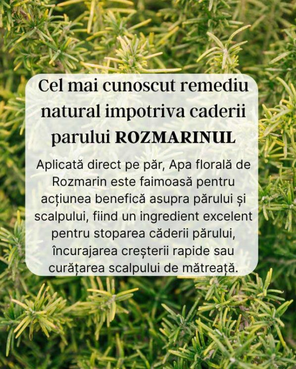 - Aplicată direct pe păr, Apa florală de Rozmarin este faimoasă pentru acțiunea benefică asupra părului și scalpului, fiind un ingredient excelent pentru stoparea căderii părului, încurajarea creșterii rapide sau curățarea scalpului de mătreață.