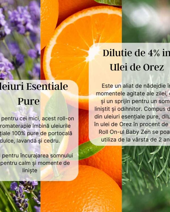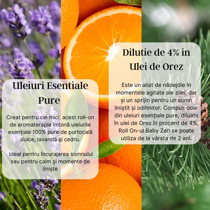 Creat pentru cei mici, acest roll-on de aromaterapie îmbină uleiurile esențiale 100% pure de portocală dulce, lavandă și cedru, ideal pentru încurajarea somnului sau pentru calm și momente de liniște. Este un ajutor natural perfect pentru momentele agitate ale zilei, dar și un sprijin pentru un somn liniștit și odihnitor. Am ales 3 uleiuri esențiale pure recunoscute pentru efectul lor de relaxare, ce aduc liniștea, pacea, miros plăcut și încurajează clipele de bucurie.