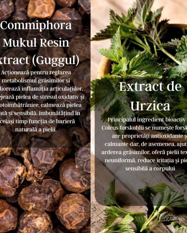ajută la reducerea țesutului adipos și grăsimilor datorită conținutului de Commiphora Mukul resin și forskolina (din planta asiatică Coleus)