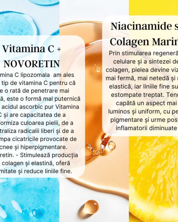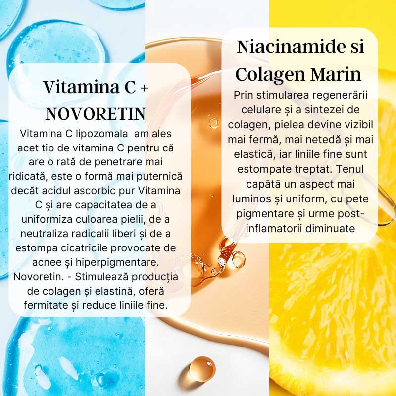 VITAMINA C LIPOZOMALA – unul dintre ingredientele ce și-a câștigat faime bine-meritat, ce deține proprietăți antioxidante asupra pielii, luptă împotriva radicalilor liberi, întărește capilarele, reduce ridurile, oferă elasticitate și fermitate prin stimularea producției de colagen intracelular. Vitamina C lipozomală are o putere de penetrare mai eficientă, la nivel cutanat, cu efect superior atât din punct de vedere al rapidității de instalare cât și în ceea ce privește eficiența.