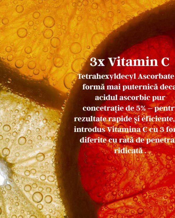 - 1. Tetrahexyldecyl Ascorbate – am ales acet tip de vitamina C pentru că are rata de penetrare mai ridicată, este una dintre cele mai eficiente forme, mai puternică decât acidul ascorbic pur, fiind și forma cu cea mai mare concentrație din cremă – 4 %. Deține o rata mai mare de conversie a Vitaminei C în structura pielii – recunoscută pentru conservarea colagenului în straturile celulare. Enzimele din structura pielii transformă acest ingredient direct în Acid ascorbic pur. Tetrahexyldecyl Ascorbate este varianta solubilă în lipide (în grăsimile pielii) ceea ce înseamnă că are proprietatea de a intra adânc în piele, cu o putere antioxidantă ridicată, luptă cu radicalii liberi din straturile profunde ale pielii și implicit protejează lipidele pielii atât de importante pentru prevenția apatiției ridurilor dar si pentru structura normală și frumoasă a pielii (protejează ceramidele și colesterolul din piele). Studiile clinice arată că și o cantitate de 0.1% din acest tip de vitamina C are o capacitate extraordinară antioxidantă.