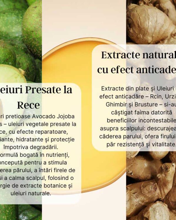 Ingrediente Aqua (Water), Persea Gratissima (Avocado) Oil, Olea Europaea (Masline) Oil, Coco Glucoside, Cocos Nucifera (Cocos) Seed Oil, Ricinus Communis (Ricin) Oil, Simmondsia Chinensis (Jojoba) Oil, Arctium Lappa (Brusture) Extract, Zingiber Officinale (Ghimbir) Root Extract, Urtica Dioica (Urzica) Extract, Cetearyl Olivate, Sorbitan Olivate, Lactobacillus Ferment, Fragrance