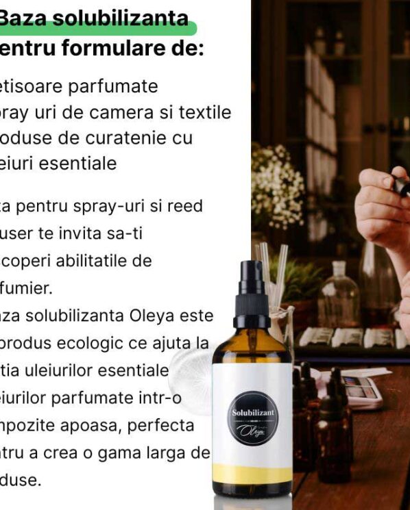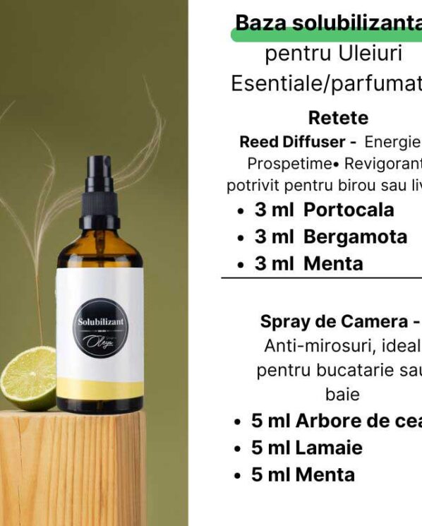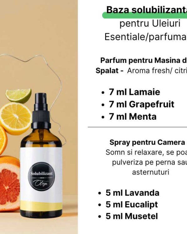 - Spray de cameră 100 ml bază solubilizantă și 15 ml de Ulei esențial sau 10 ml de Ulei parfumat
